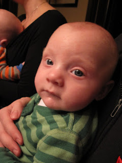 Four months old! The boys had their poke-and-prod on wednesday. Just this week they have started to notice one another. Actually, I think it's the clothes. I keep seeing Liam staring intently at Dash's bottom, and then realize that he's probably appreciating the contrast of the superb red and white robots on his pajamas. And Dash stares dreamily at Liam's.....striped shirt. But it's a start! They are smiley, wiggly, and utterly charming.